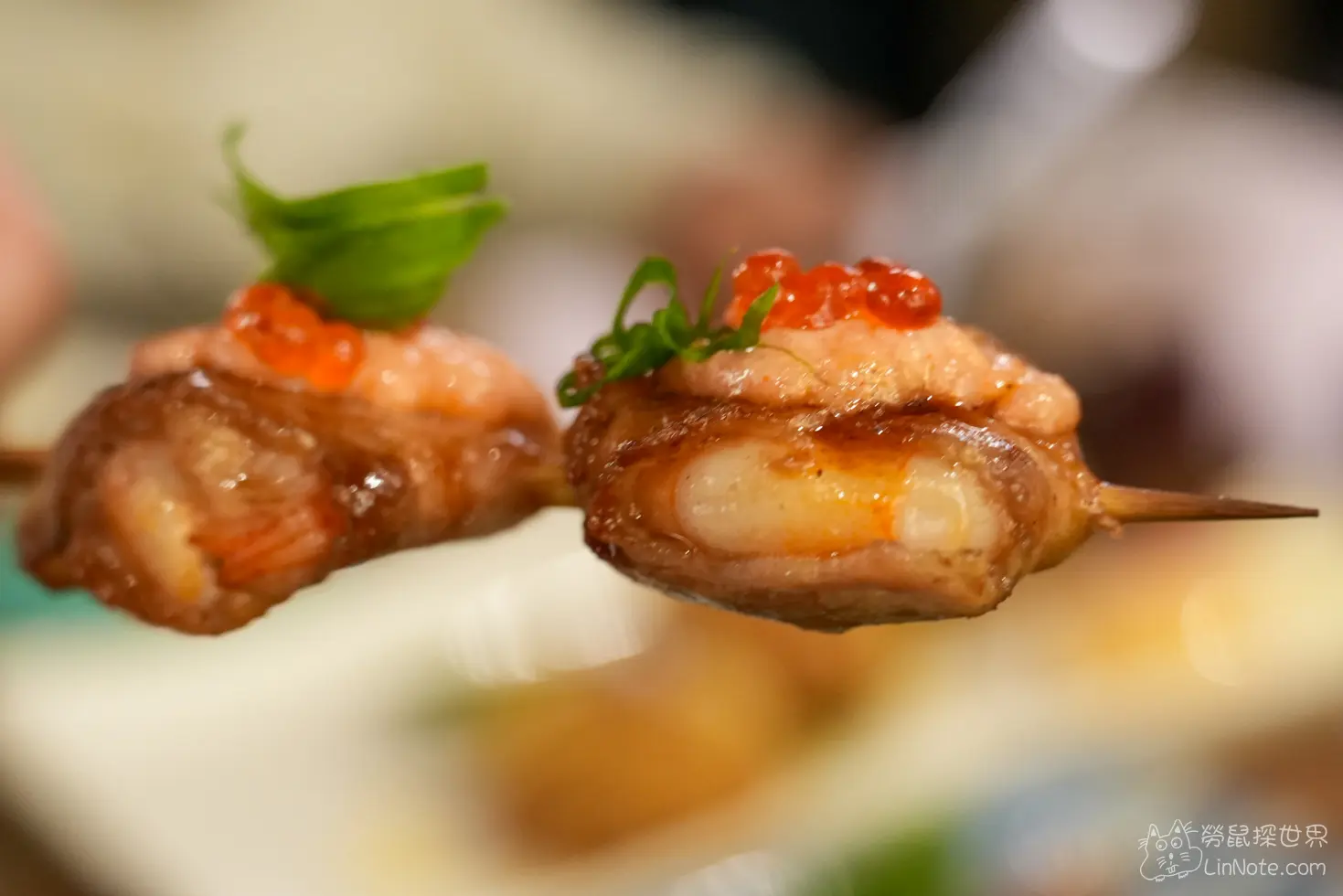 豬肉海老啵啵一口下去是濃郁的明太子香味,再來就是鮮蝦的脆感及蝦肉的鮮甜味,之後才是豬肉突出的鮮味,最後鮭魚卵的味道才跑出來,非常有口感層次的一道串燒。