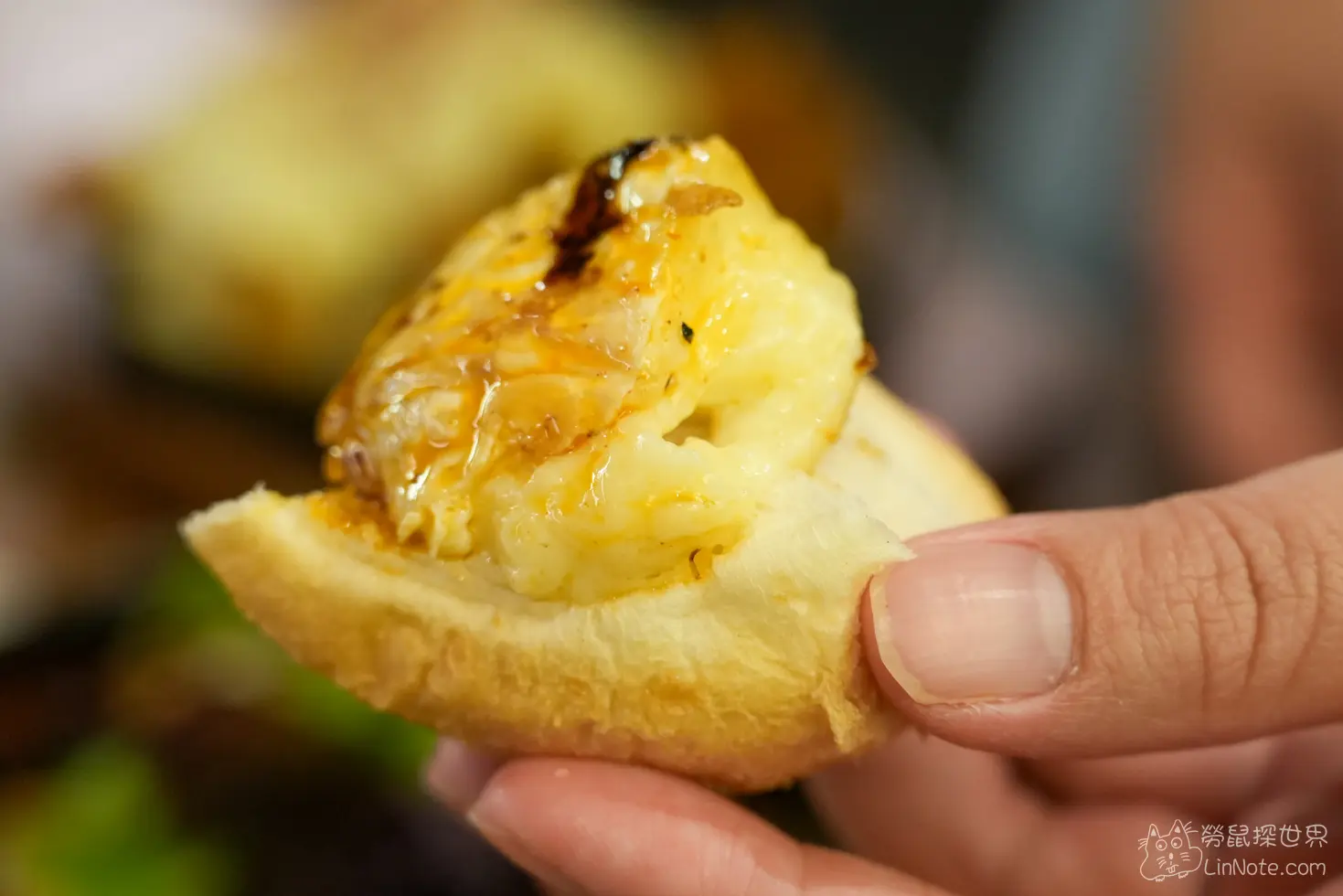 卡門貝爾起司麵包的起司真的是濃郁的沒話說,整整一大塊起司經過炙烤後,直接抹在麵包上,滿口的起司香味,下面還有油醋增加風味,一塊麵包真的不夠吃呀!