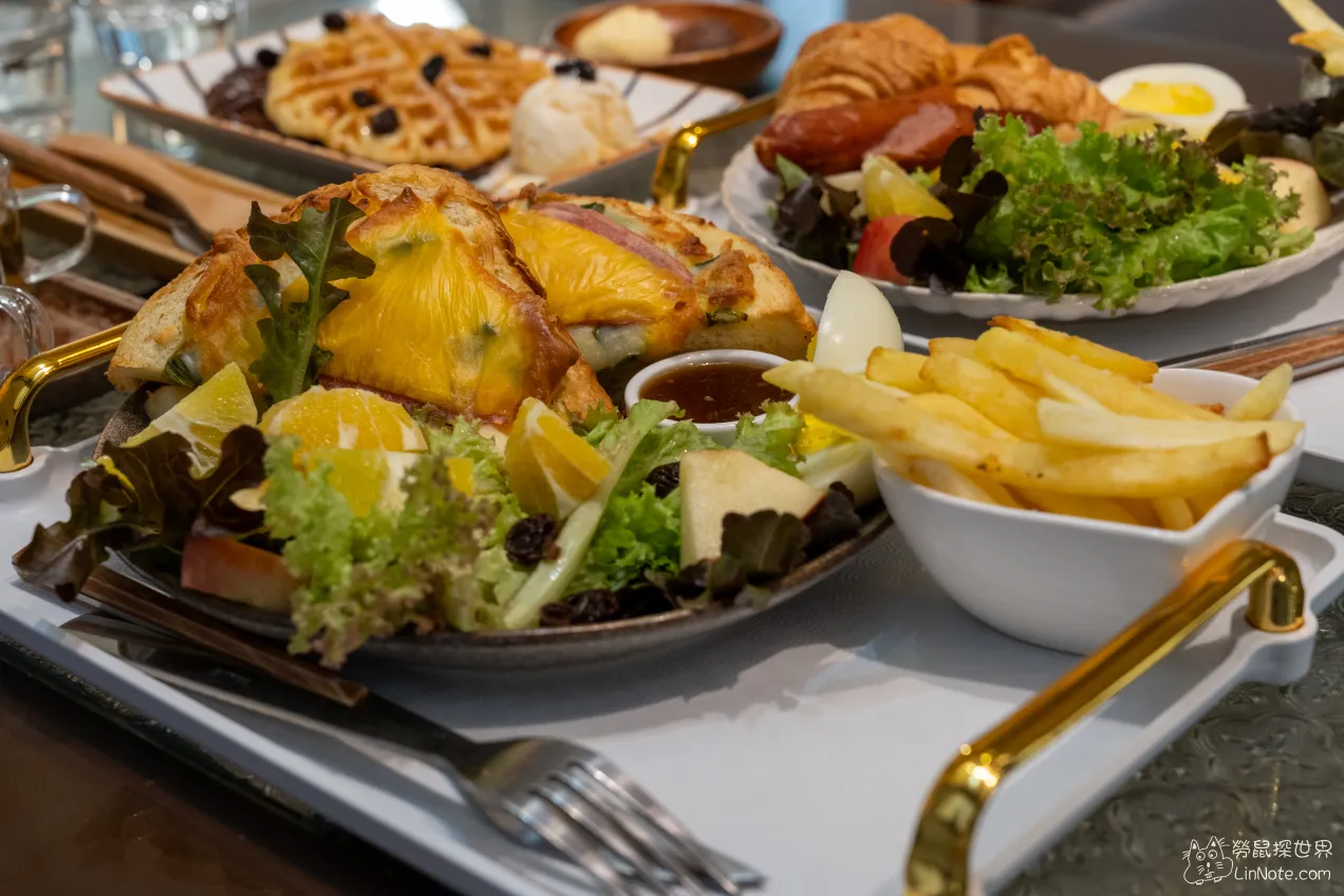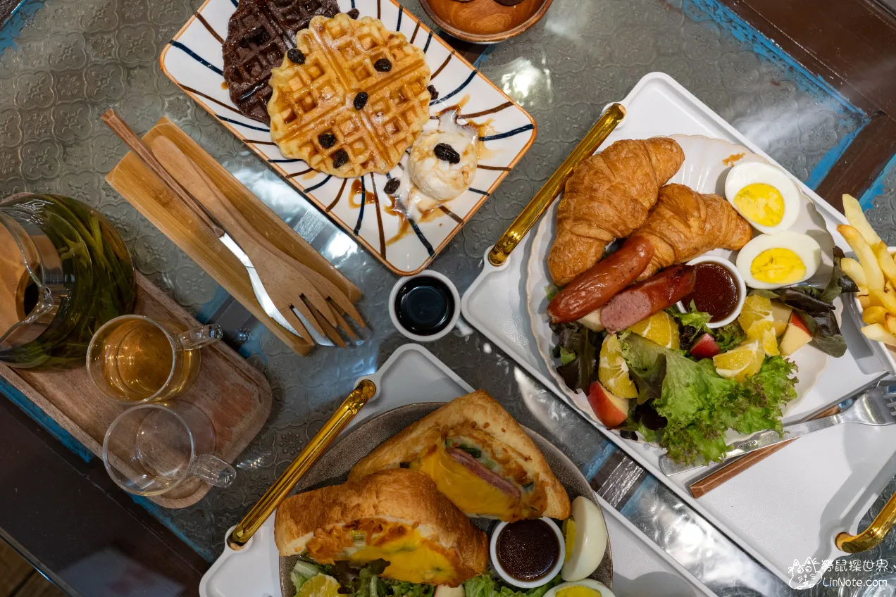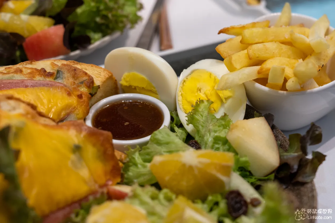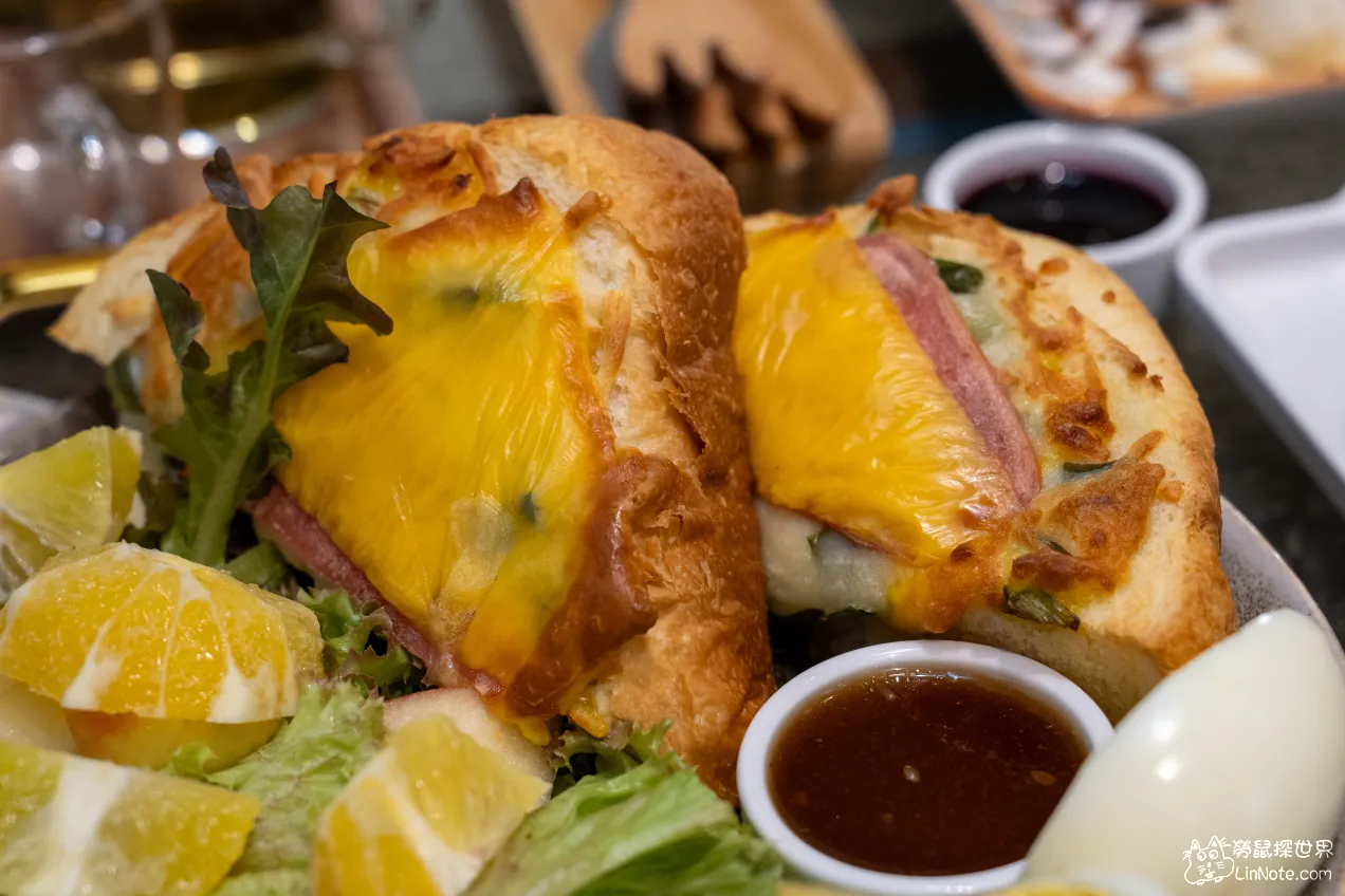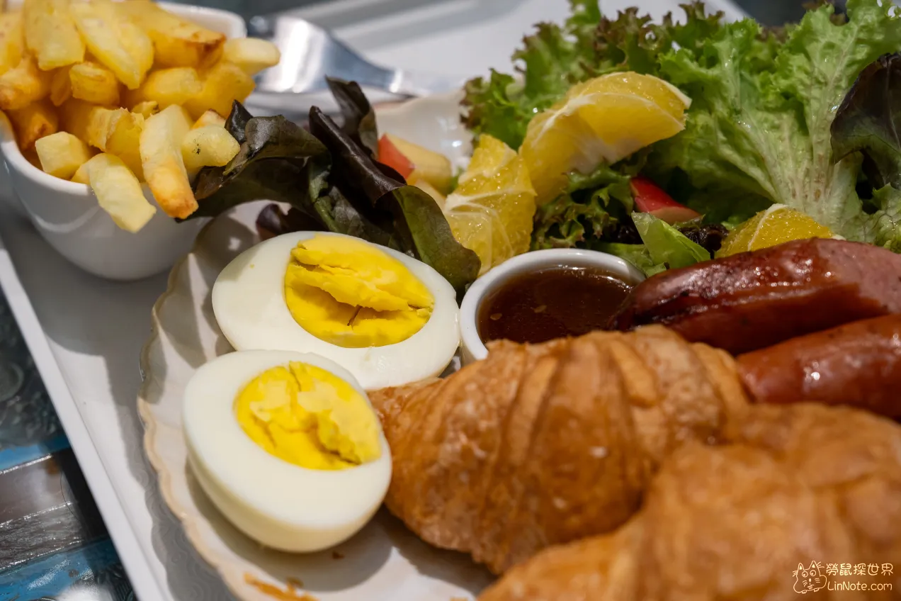 除了主菜不一樣外,配菜都與上述的起司火腿蔥厚片相同。雙胞胎可頌表示有兩個可頌,這裡的可頌屬於口感扎實一點,不過外皮沒有到很酥,個頭偏大一點,所以兩個可頌吃下去有點飽!旁邊還有一條德式香腸,Q彈好吃。