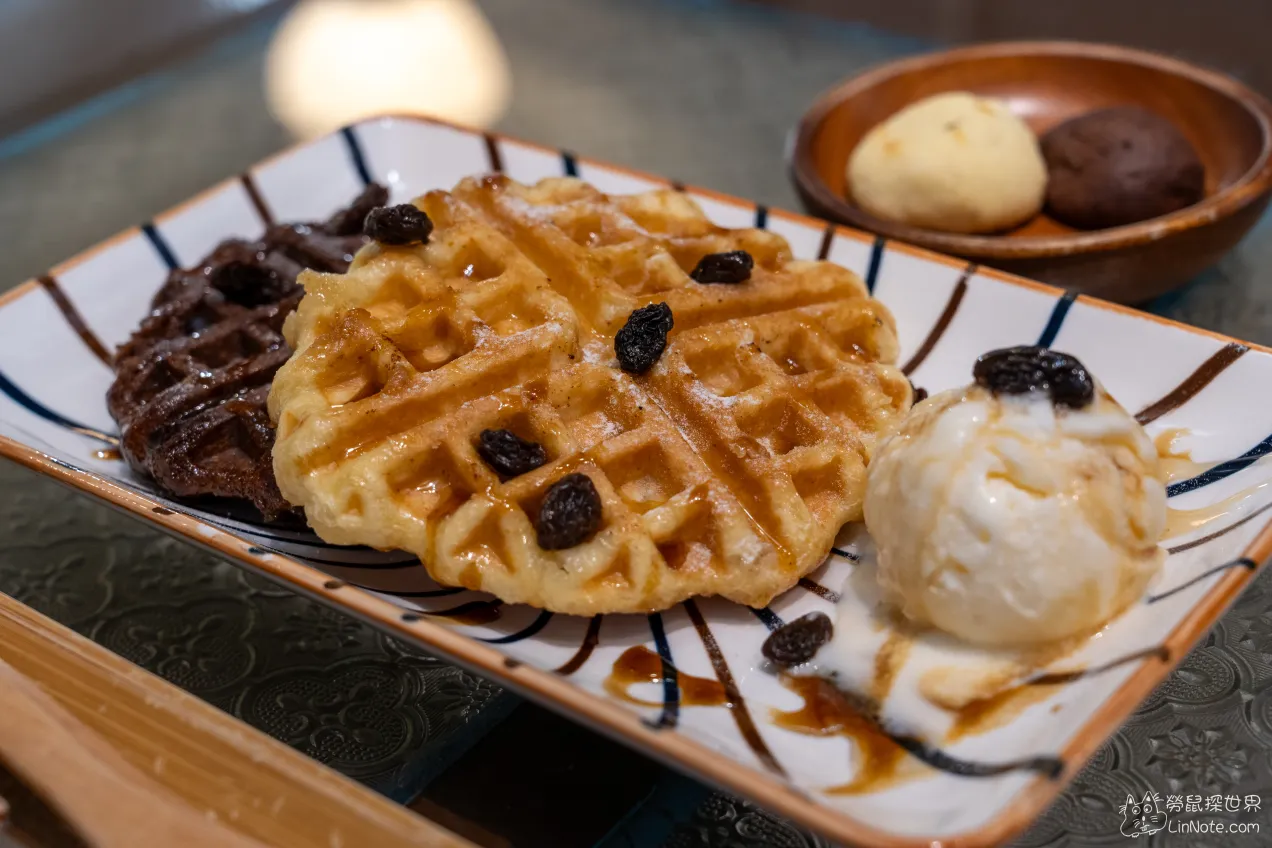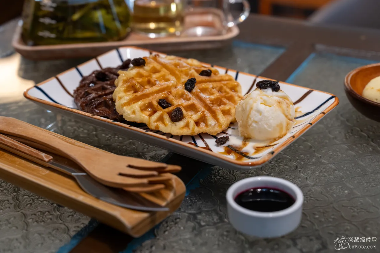 比利時鬆餅有原味及巧克力兩種口味,旁邊還附贈一球冰淇淋,居然還送上莓果醬,搭配很豐富,鬆餅紮實口感搭上微微的香草香,軟軟的鬆餅一下就被我們吃完了,後面才想到有莓果醬,沒有沾到太可惜了。
