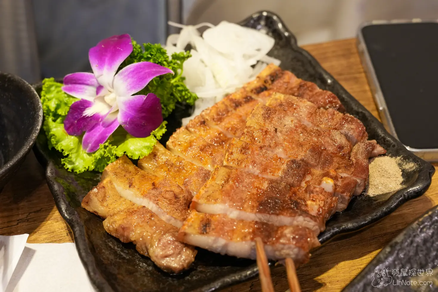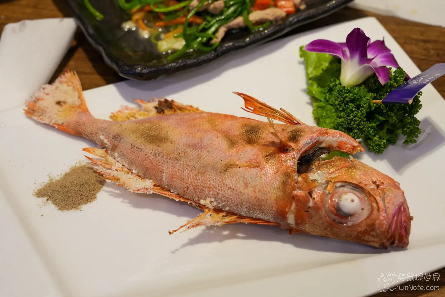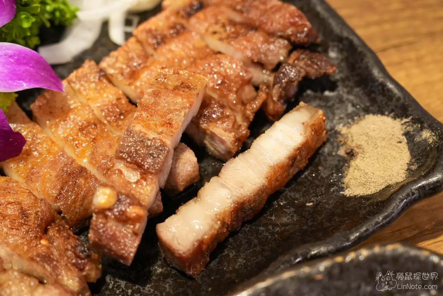 椒鹽五花肉可說是當天最令我們驚喜的一道料理,因為我們知道這裡的海鮮非常新鮮,所以有預期他的海鮮會很厲害,但沒想到椒鹽五花肉也很讚,首先是他的份量,超級大塊的五花肉看得食指大動,他的外皮烤到兩面焦脆,瘦肉與肥肉剛好吃起來多汁香甜又不會過度油膩,搭配洋葱與胡椒鹽,真的是會令人一口接一口的邪惡美味。