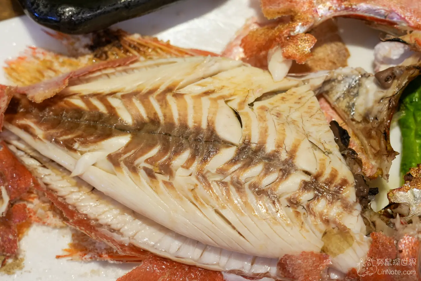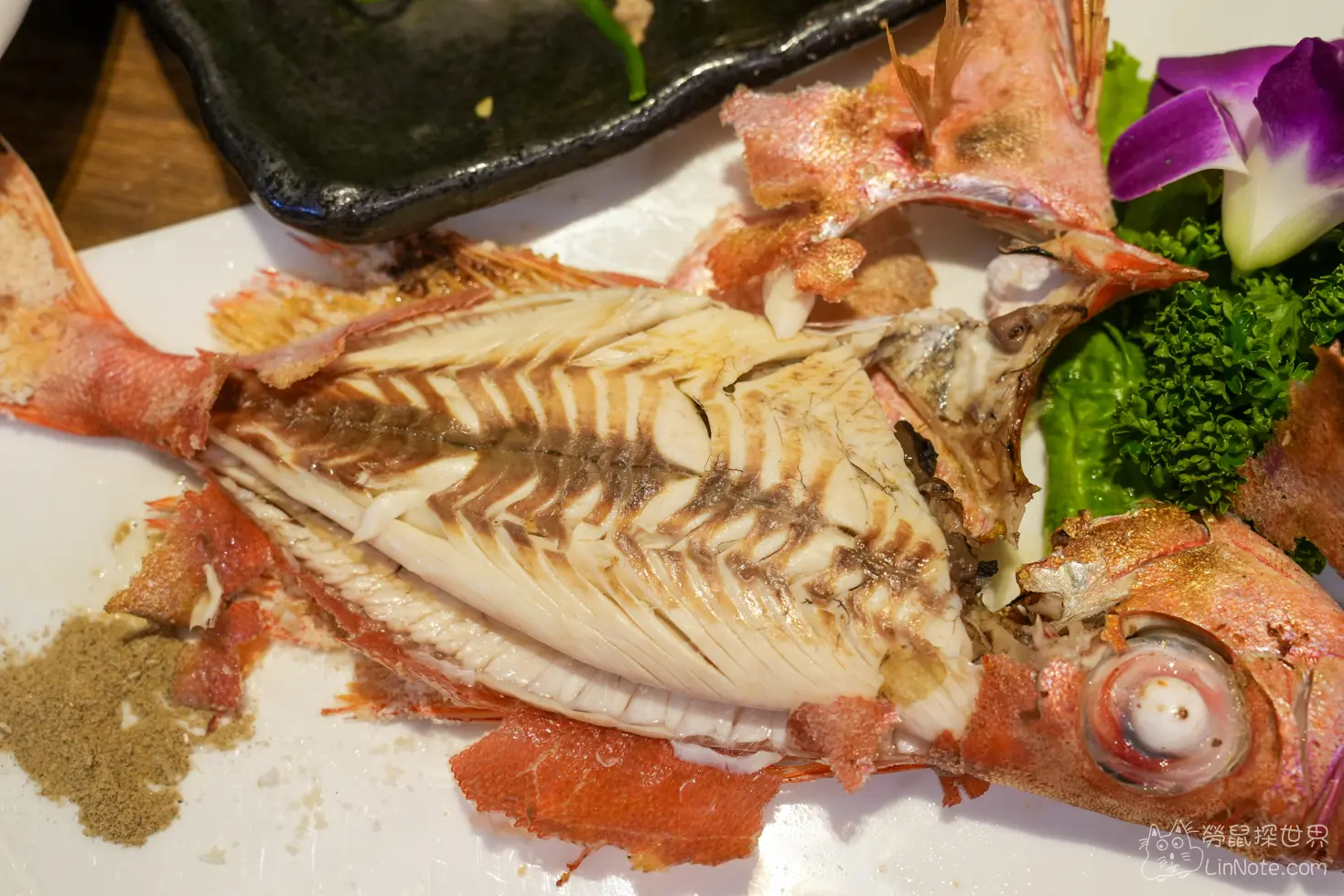 烤食令現撈魚都是觀看當天的漁獲的,所以每次都可能吃到不一樣的烤魚,這隻是紅喉,是台灣東部特有的魚種,肉質非常細緻,口感紮實,吃起來帶有油脂香,非常新鮮,另外店家還貼心提醒魚眼可以吃,裡面富含膠原蛋白,吃起來很Q彈。