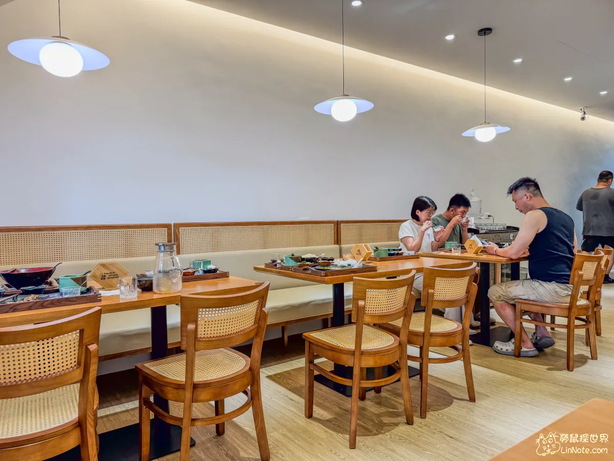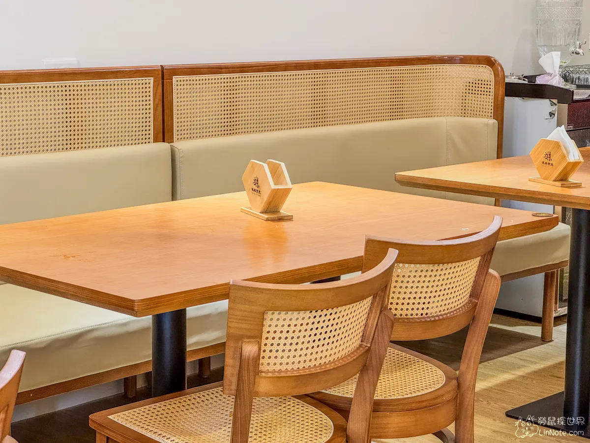 餐廳內體色調偏暖色系,採用了大量的木質材料,這類型的桌椅在台灣比較少見,因為老闆長年在大陸工作,是近期才回台灣開業,對台灣的傢俱不太熟悉,所以直接從大陸進口。
