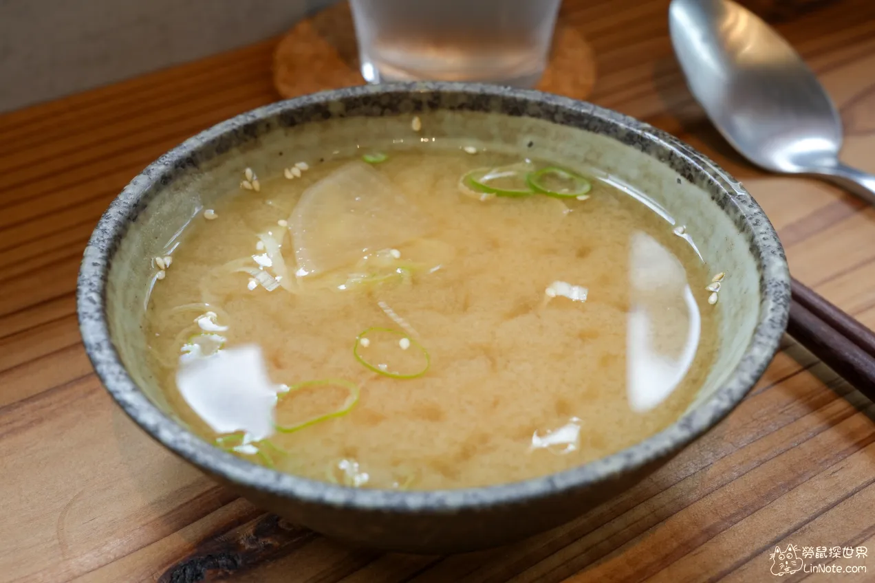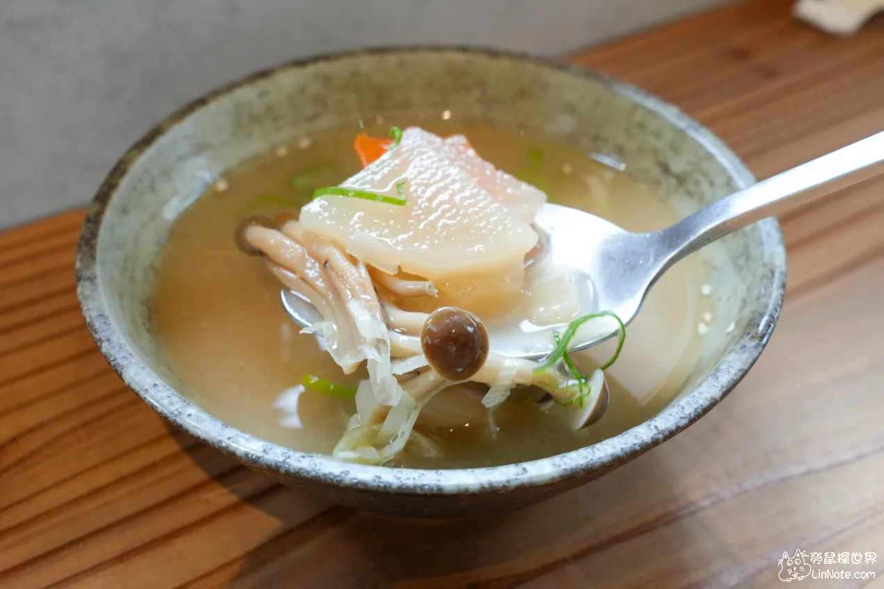 味噌湯的味噌味很足,裡面的料非常豐富,有蘿蔔跟鴻禧菇,似乎可以續碗。
