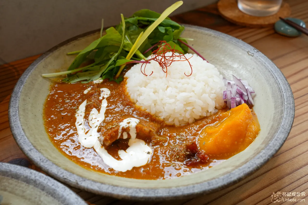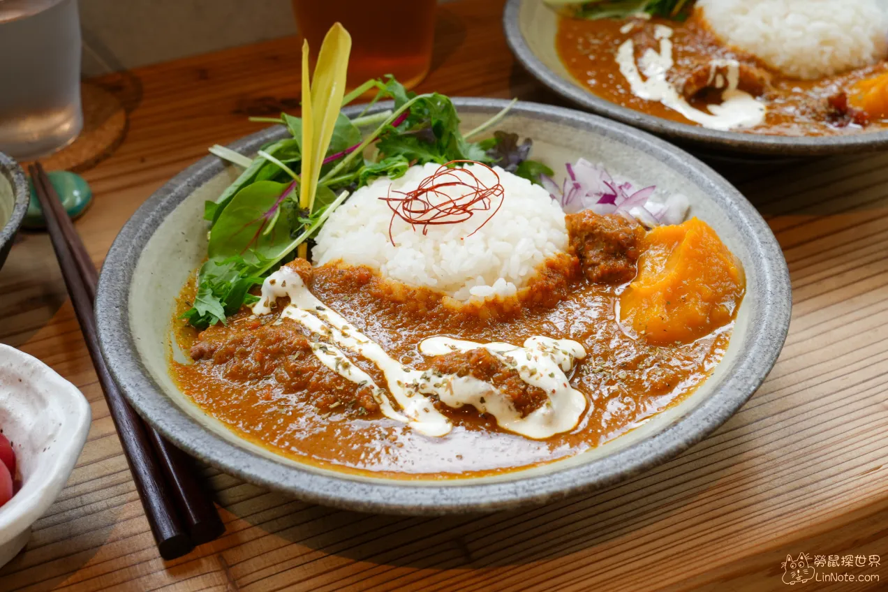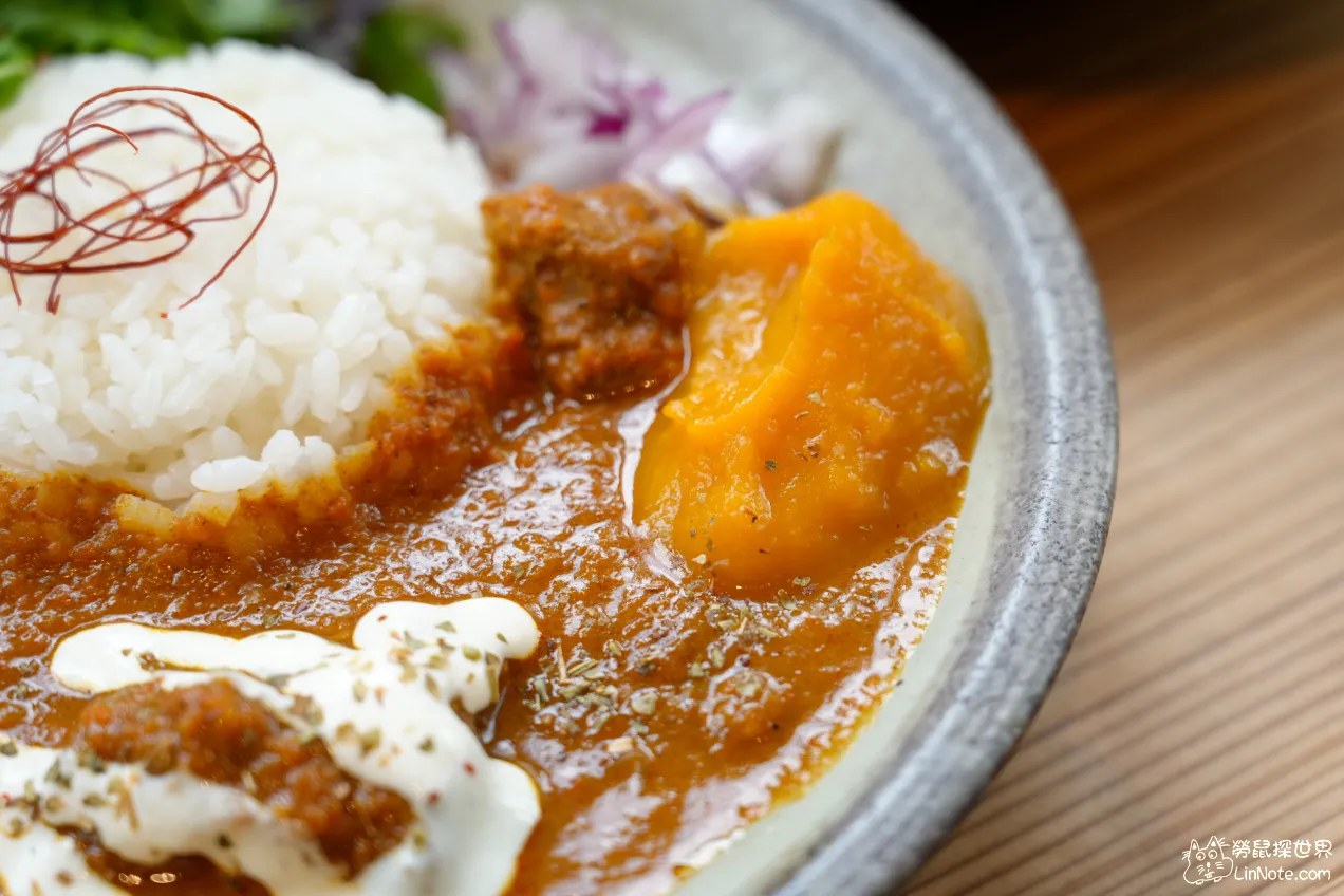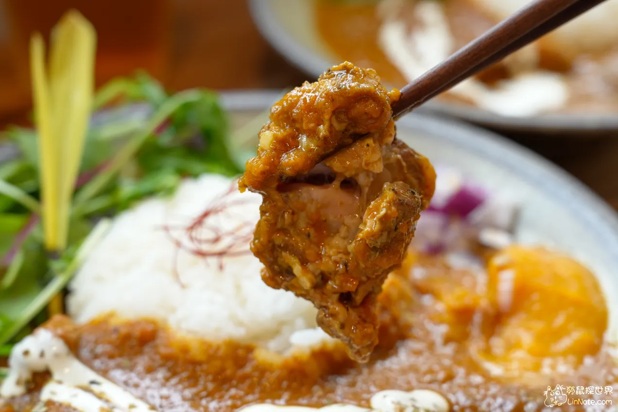 這裡的咖哩非常特別,不是常吃到的日式咖哩,而是老闆特製的印度風味咖哩,咖哩口感沙沙的,應該是香料打碎留在裡面, 香料味道非常豐富,感覺還有大量蔬果,味道非常有層次,有一種香料味特別重,應該是荳蔻吧!