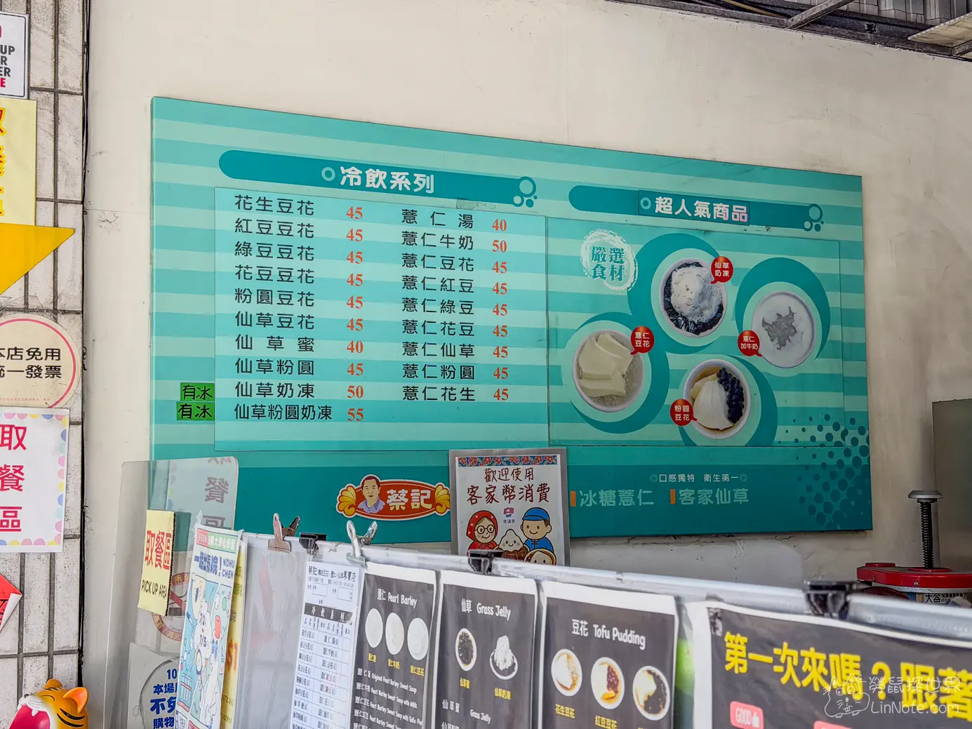 牆壁貼滿了建議品項,雖然是豆花店,可是招牌居然是薏仁牛奶及仙草奶凍,非常特別,既然店家都標示他們家的招牌了,我們就不可免俗的點了這兩樣產品。
