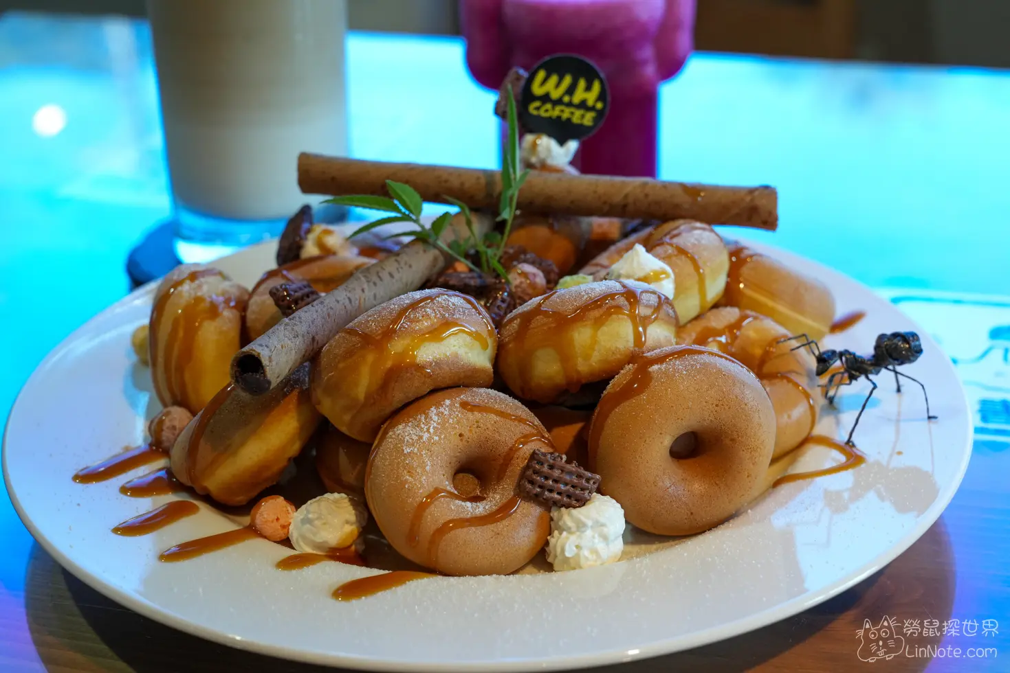 W.H. Coffee的鬆餅跟外面的長得非常不一樣,他是一個一個的小甜甜圈狀的造型,非常適合一群朋友分食。份量很大,目測接近 20 顆左右,共享性強,一人一顆不用刀子切非常方便。