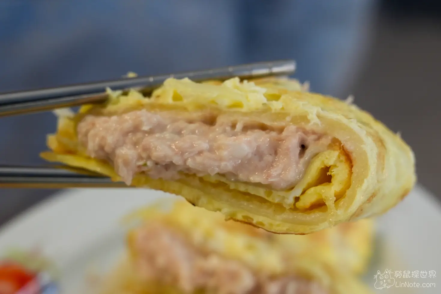 鮪魚蛋餅拌有沙拉醬與洋蔥,洋蔥香氣明顯、鮪魚濕潤,蛋餅皮為粉漿,口感較軟,整體吃起來濕潤且帶洋蔥香。