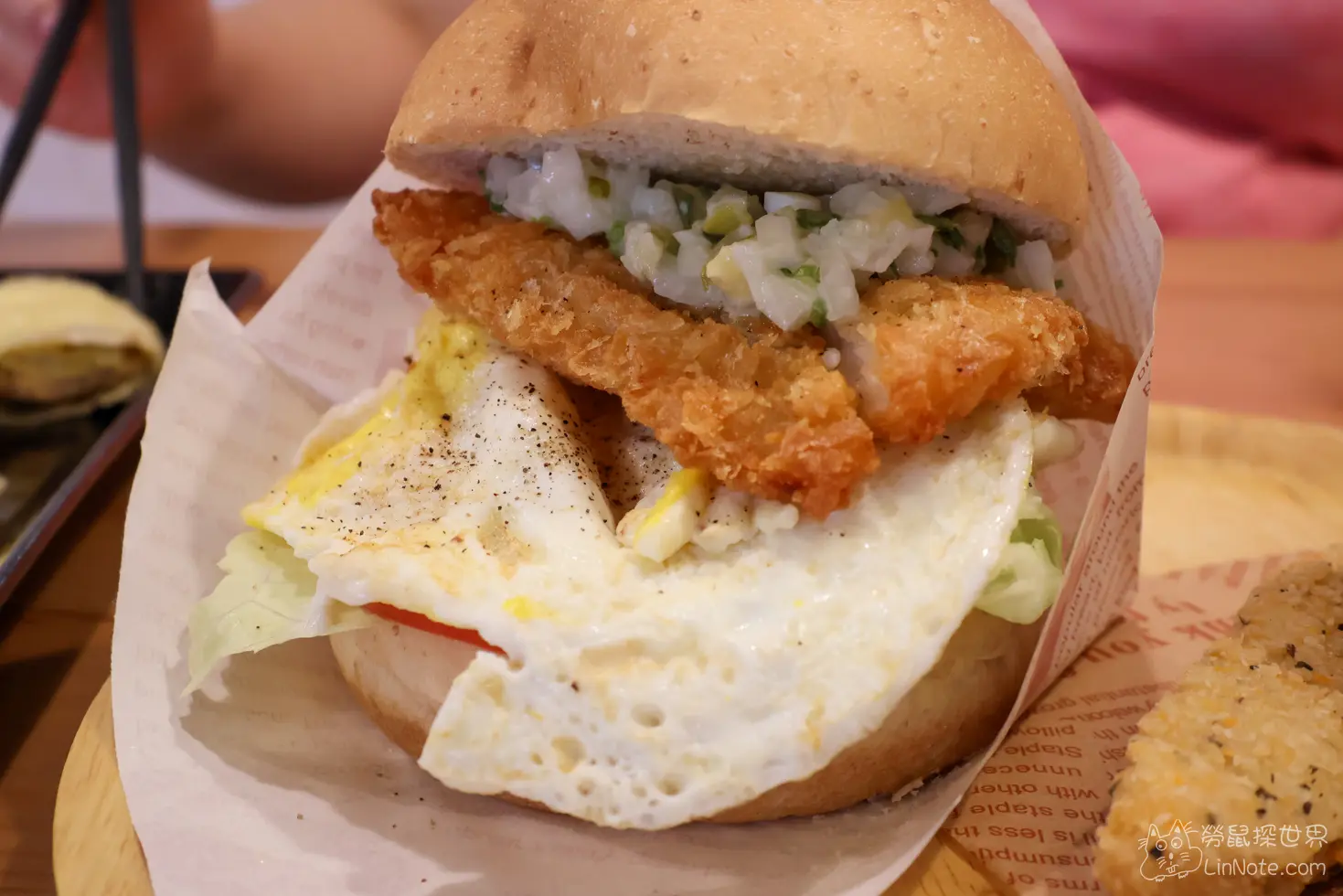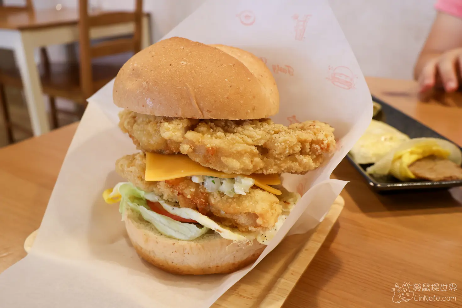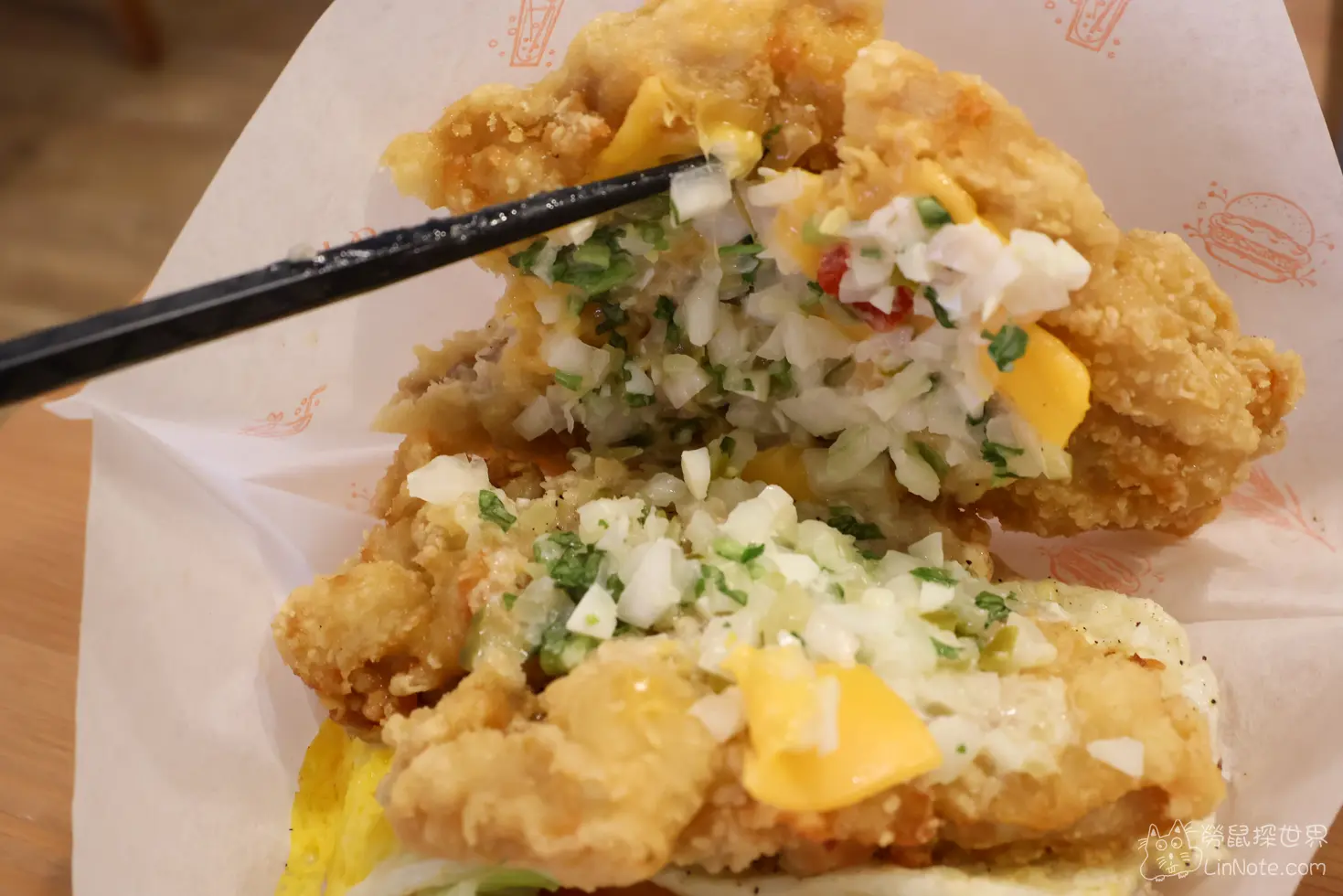 這款漢堡比想像中大非常多,內餡真的是兩塊完整的大雞腿肉!表面雖看起來略乾,但咬下去卻軟嫩多汁,還帶有雞腿的鮮甜。漢堡內塗了濃郁美乃滋,搭配大量蔥與大蒜,香氣十足但不會搶味。份量驚人,一份就能非常有飽足感。