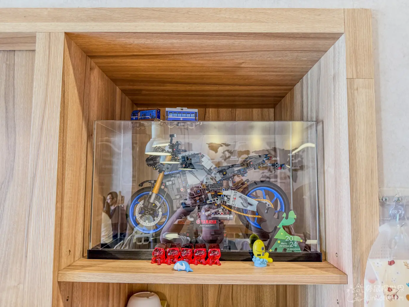 店家還收集了許多的模型,擺設在木質展示櫃裡,像是這的 YAMAHA 重機模型、小火車車廂、以及各種可愛小公仔。