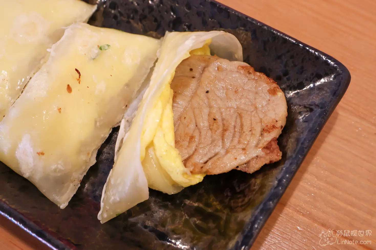 蛋餅外皮煎得金黃漂亮,黑胡椒與里肌肉的香氣融合,味道與想像中一致,耐吃不膩。