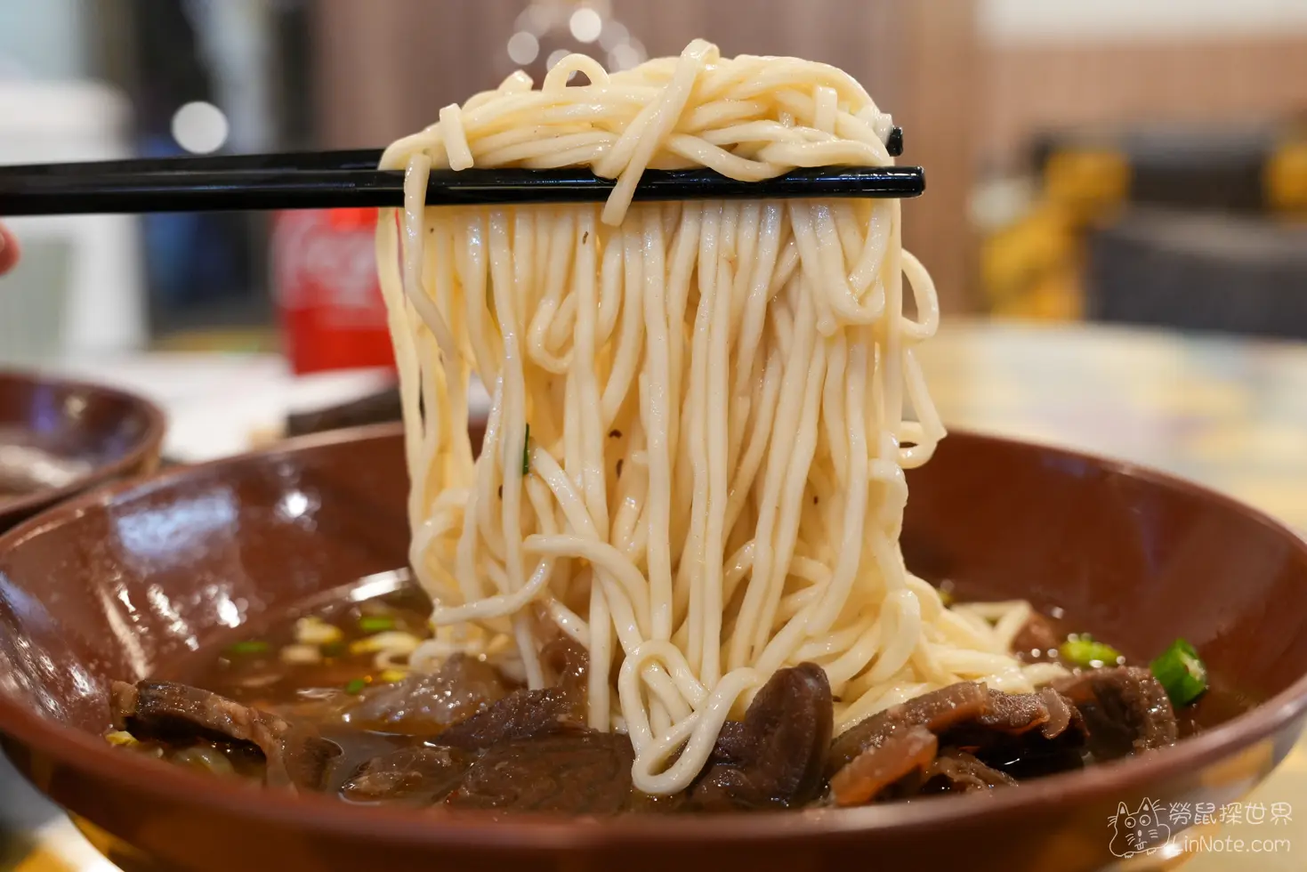 牛肉麵的部分,紅燒湯頭帶點微微的辣,對小朋友來說可能比較不適合,湯頭的味道比想像中淡一點點。肉塊的部分,牛肉稍微有點硬,需要多咬幾口,但牛筋表現就非常出色,滷得非常嫩,吃起來很有膠原蛋白的感覺。麵條的部分跟海鮮麵不太一樣,比較有口感。